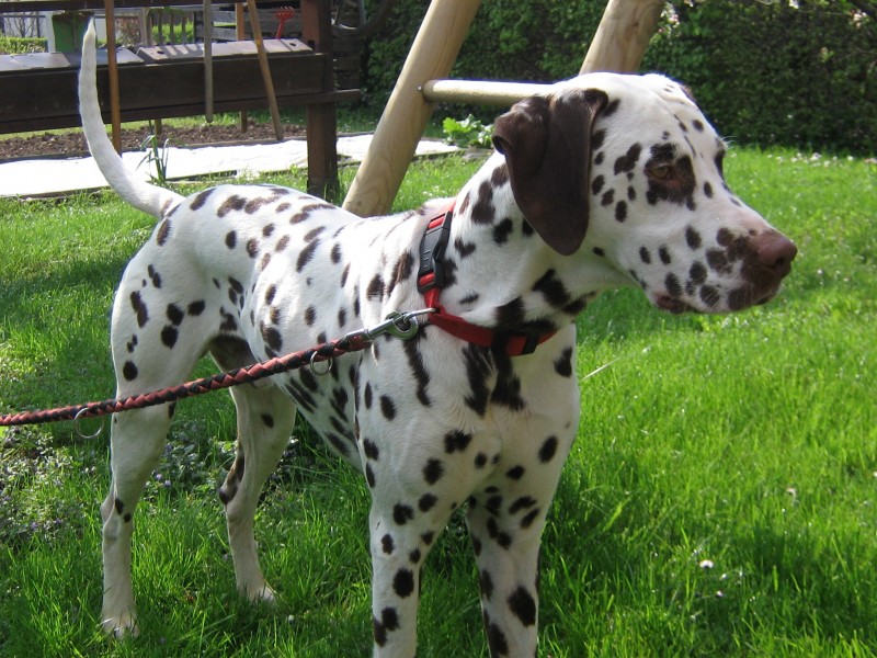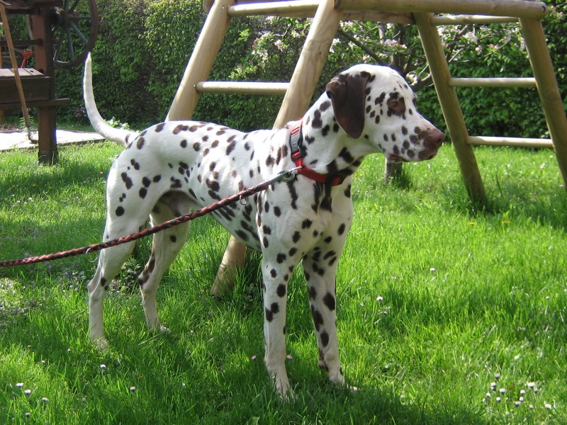 Sicer pa jo imam na sprehodu večinoma kar spuščeno, če jo pokličem pride k meni, pa tudi oddalji se vedno samo toliko, da me še vidi. Če je pa kdaj preveč svojeglava, je potem kakšen dan na povodcu, pa je spet pridna  ;)  Sem pa že od začetka veliko delala na odpoklicu, so me vsi tako strašili, da pri dalmijih težko dosežeš dober odpoklic.