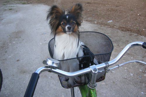 Tudi jaz imam košarico za Winny, čeprav je ona zadovoljna tudi, če gre recimo za ene 15min mal tečt ob kolesu (na fleksiju), pa se potem mal vozi... Jaz je nimam privezane, je pa navajena, da se med vožnjo ne ustaja, ampak lepo mirno počaka.