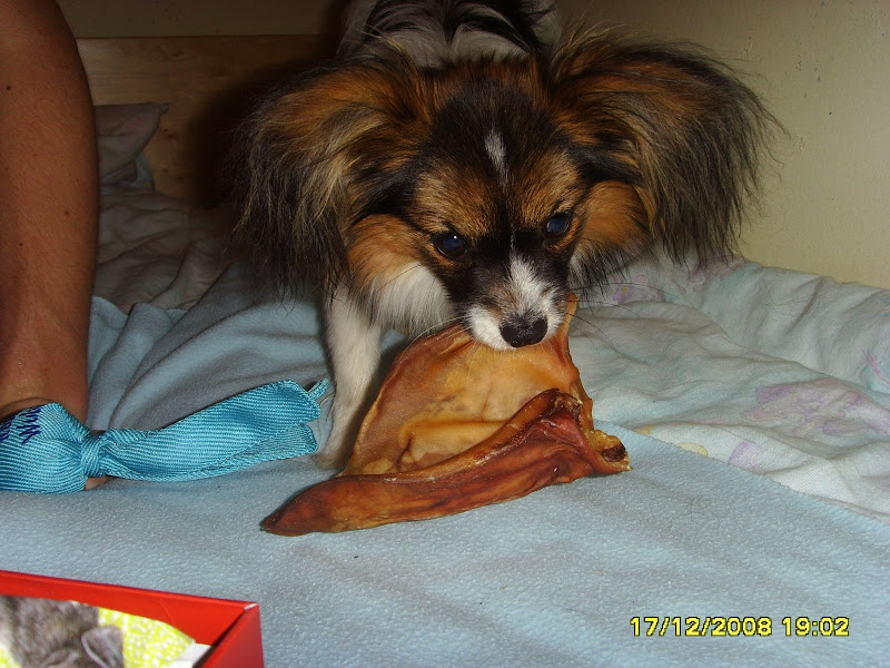 hih drugač pa tole je maiev prvi svinjski uho, tko da ga je lizu neki pa mal že probu zagizt, mu ga bom pa dala  na božičn večer, da se ga bo mal bl lotu...  ;D